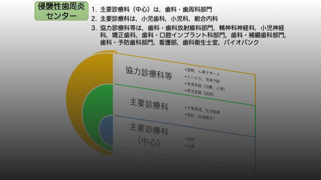 当センターでは,歯周病専門医が所属する歯科・歯周科部門を中心に,小児歯科,小児科,そして総合内科の4科を主要診療科として,診断と治療にあたります。さらに10の協力診療科等とも連携して,心のケアなども含めた幅広く医科歯科連携で診療にあたります。