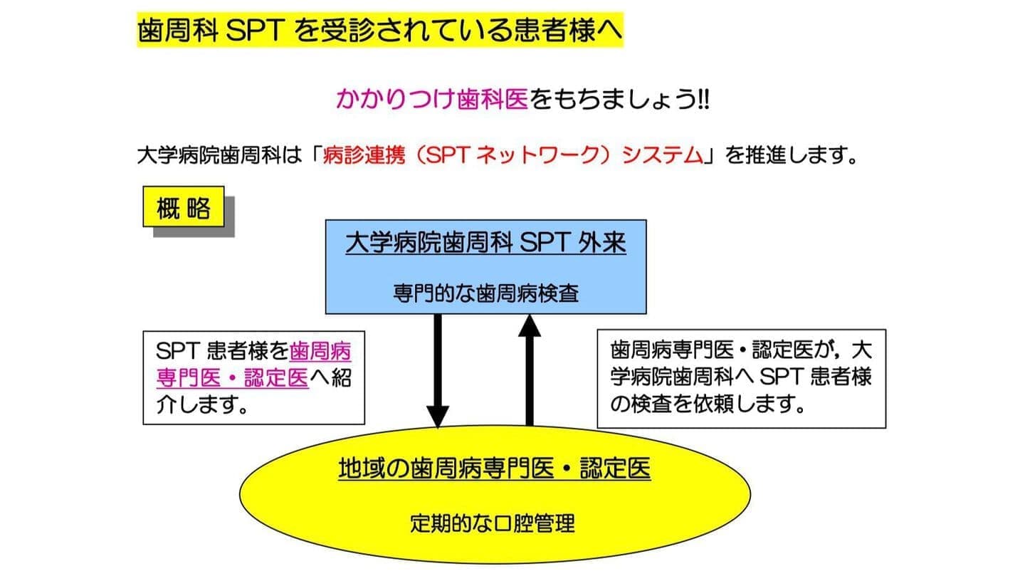 歯周病安定期治療(SPT)期となり,定期的な口腔管理(衛生管理と咬合力による咬合性外傷)と生活習慣の管理によって今後に良い状態を維持できる場合に,地域の歯周病専門医や歯周病認定医へこれらの管理を依頼する『病診連携医療』です。