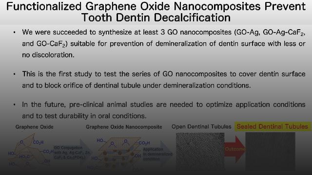 例えば,歯周病治療後や高齢者では,歯根が露出するために,歯根部の知覚過敏症が問題となって生活の質(QOL)が低下します。 さらに,歯根面にう蝕が発生しやすいことが問題となります。 そこで,薄層の炭素からなる酸化グラフェンと金属イオンを混合して作成した機能性複合体を歯根面に塗布することで,歯根の象牙細管を封鎖して歯質を強化するだけではなく,歯根面に付着する細菌を抑制させることが分かりました。